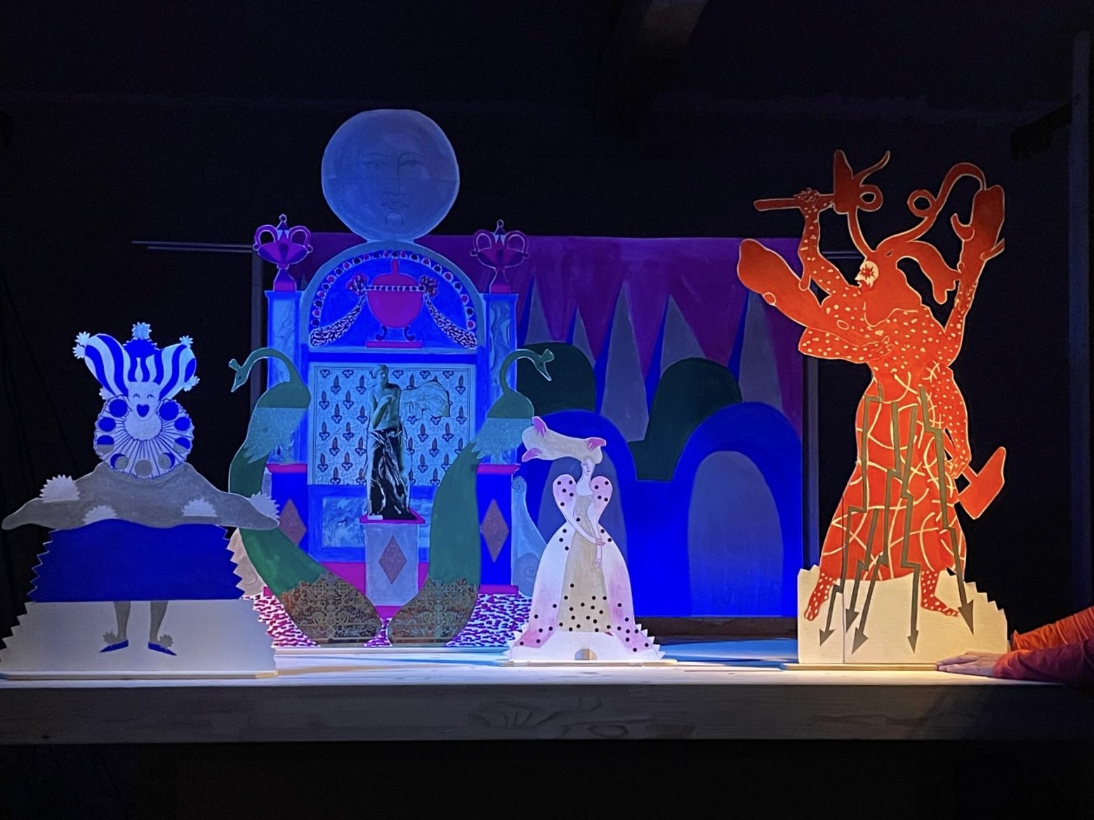 Tous les personnages et les décors sont des figures peintes sur papier, manipulées à vue par deux comédiens, Laeticia Brécy et Jean Diégo, placés de part et d’autre du plateau. Ils prêtent leur voix à tous les personnages, en les faisant se mouvoir et s’émouvoir dans un jeu très engagé.