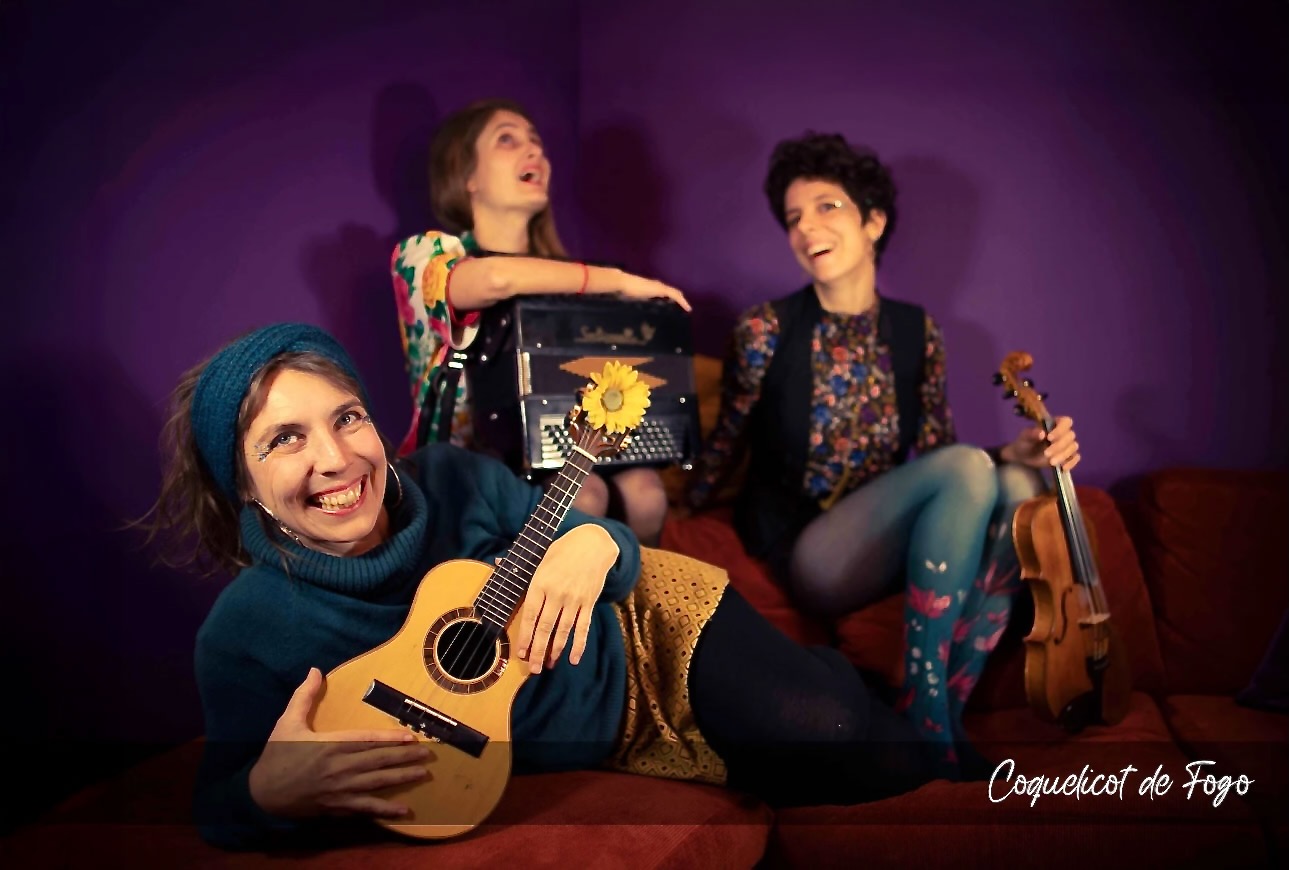 Coquelicot de Fogo, phœnix féminin à trois têtes, doit son nom à la plante qui surgit dans les flammes. Les pieds nus ancrés dans cette terre incandescente, les Coquelicot donnent à goûter leur musique pimentée et fleurie aux parfums cosmopolites. Avec leurs percussions, elles convient les épidermes à un peau à peau pétillant.